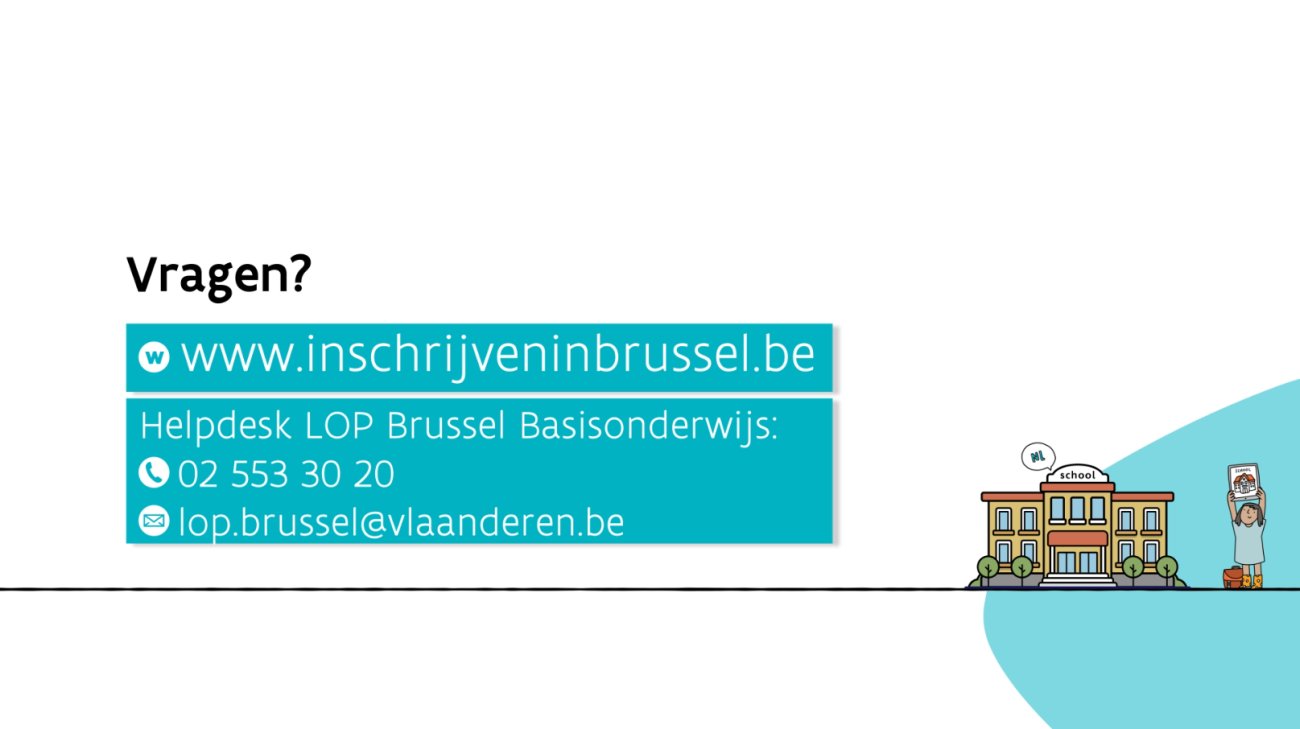 Heb je nog vragen? Ga naar inschrijveninbrussel.be. Of contacteer de helpdesk van het LOP Brussel Basisonderwijs.